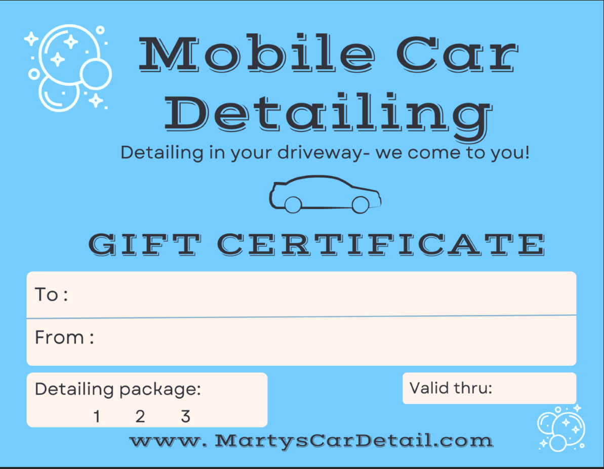 Store Ultimate Detail Gift Certificate (ALL VEHICLE TYPES) $380.00 Purchase Added! Deluxe Detail Gift Certificate (ALL VEHICLE TYPES) $284.00 Purchase Added! Basic Detail Gift Certificate (ALL VEHICLE TYPES) $180.00 Purchase Added! Exterior Only Gift Certificate (ALL VEHICLE TYPES) $258.00 Purchase Added! Interior Only Gift Certificate (ALL VEHICLE TYPES) $258.00 Purchase Added! Gift Card from $50.00 Select Value $50.00 $75.00 $100.00 $125.00 $150.00 $175.00 $200.00 $225.00 $250.00 $275.00 $300.00 $325.00 $350.00 $375.00 $400.00 Purchase Added!